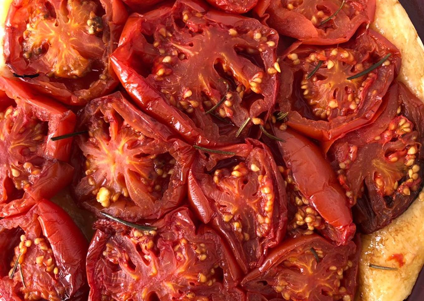 - Mettre vos tomates dans un plat à tarte, faces contre le plat, arroser les d’un filet de vinaigre balsamique, de sucre en poudre et du romarin et thym. Ajouter sel et poivre.