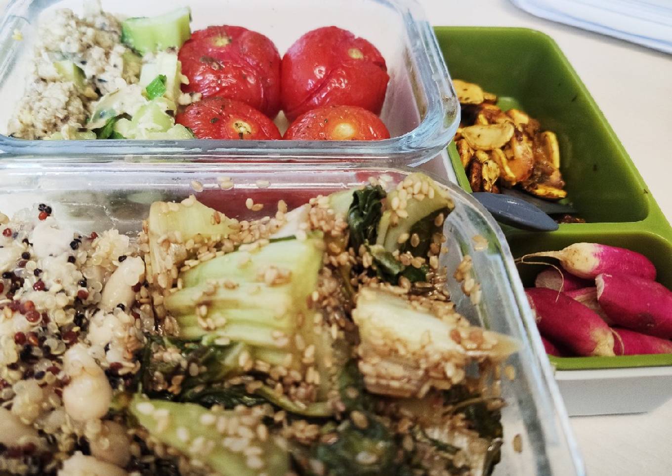 - Présentation : dans le tup 1: oeufs brouillés(plus sec et croquant) et tomates (juteux et mou)/ tup 2 : quinoa mélangé à des haricots blanc (texture crémeuse) et wok (texture croquante). Pour la grignote : les radis et les graines grillées.