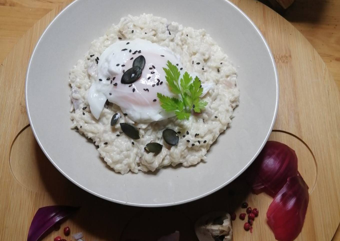 - Casser l'œuf dans un petit bol. Faire un tourbillon avec un fouet et verser votre œuf.au centre. Laisser cuire 3 minutes puis retirer l'œuf à l'aide d'une écumoire. Positionner sur le riz, agrémenté de grainé de courge et de fleur de sel et Bon appétit.