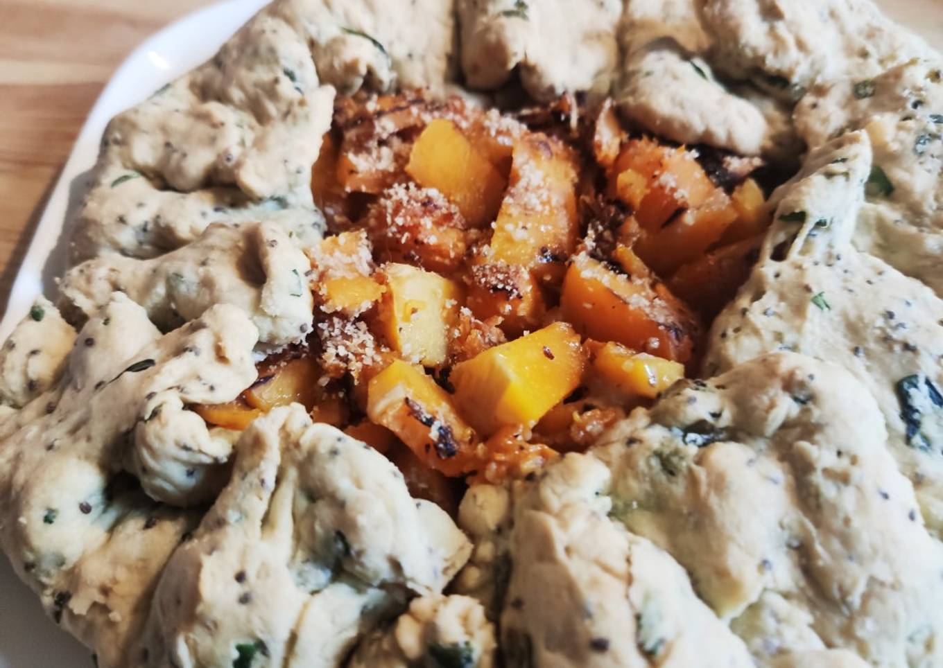 - Napper de parmesan/levure maltée la pâte, ajouter le potimarron, saupoudrer de poudre de noisette. Recourber les bords de la pâte.