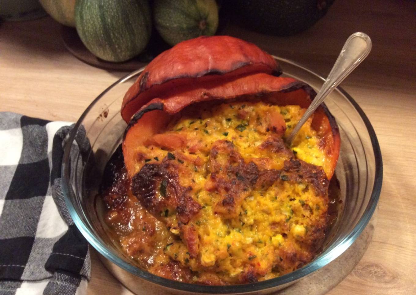 - Mélanger la chair de la courge avec le fromage, la crème, le piment d'Espelette et la courgette coupée en petits dés.
