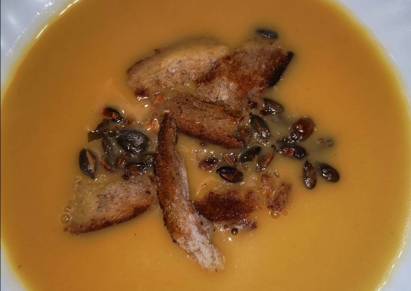 - Servez avec quelques bouts de pain et graines de courge grillées.