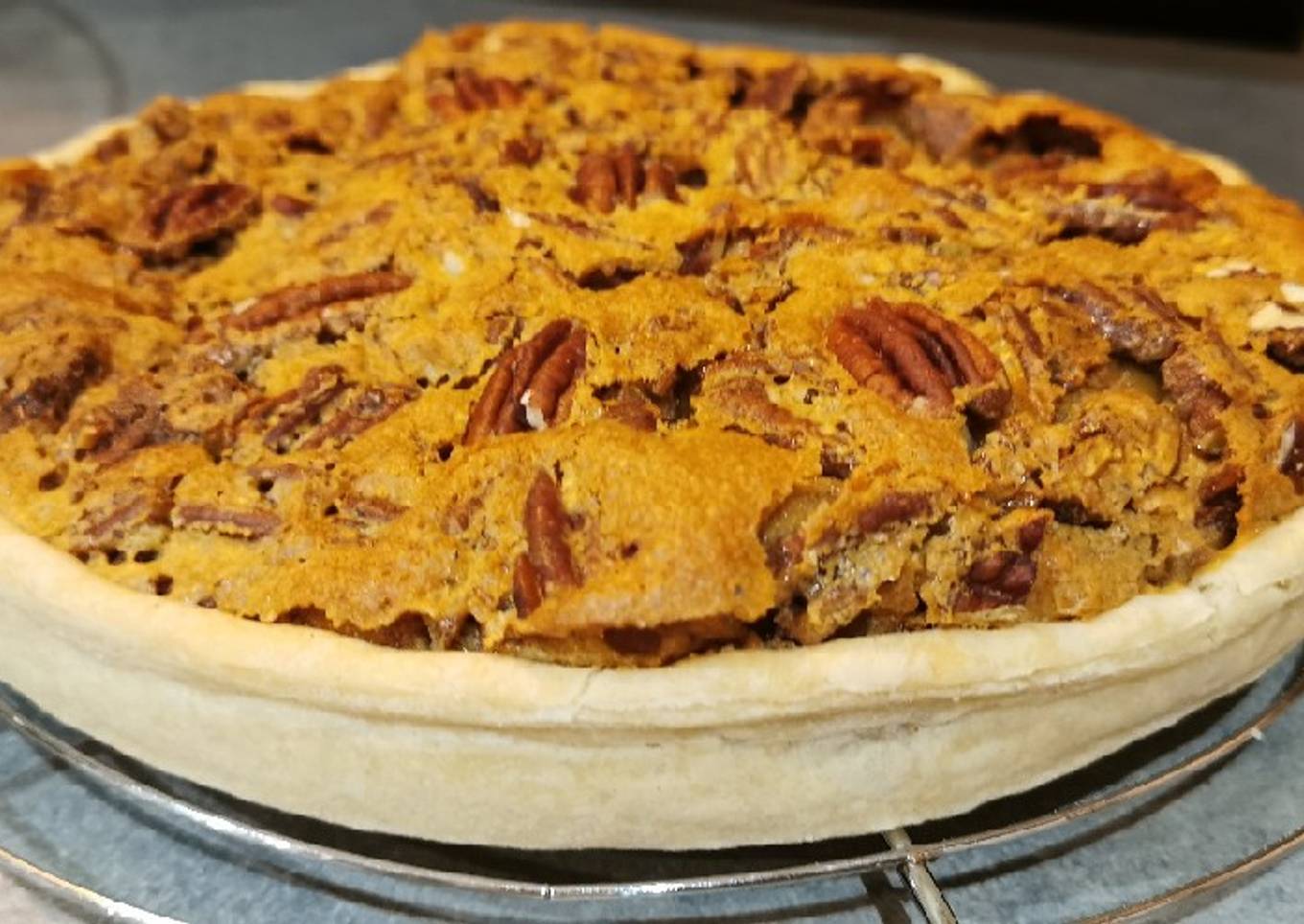 - 🇫🇷 Verser l'appareil sur la tarte. Décorer avec les noix de pécan entières. Cuire 45 minutes à four préchauffé 160°c.
