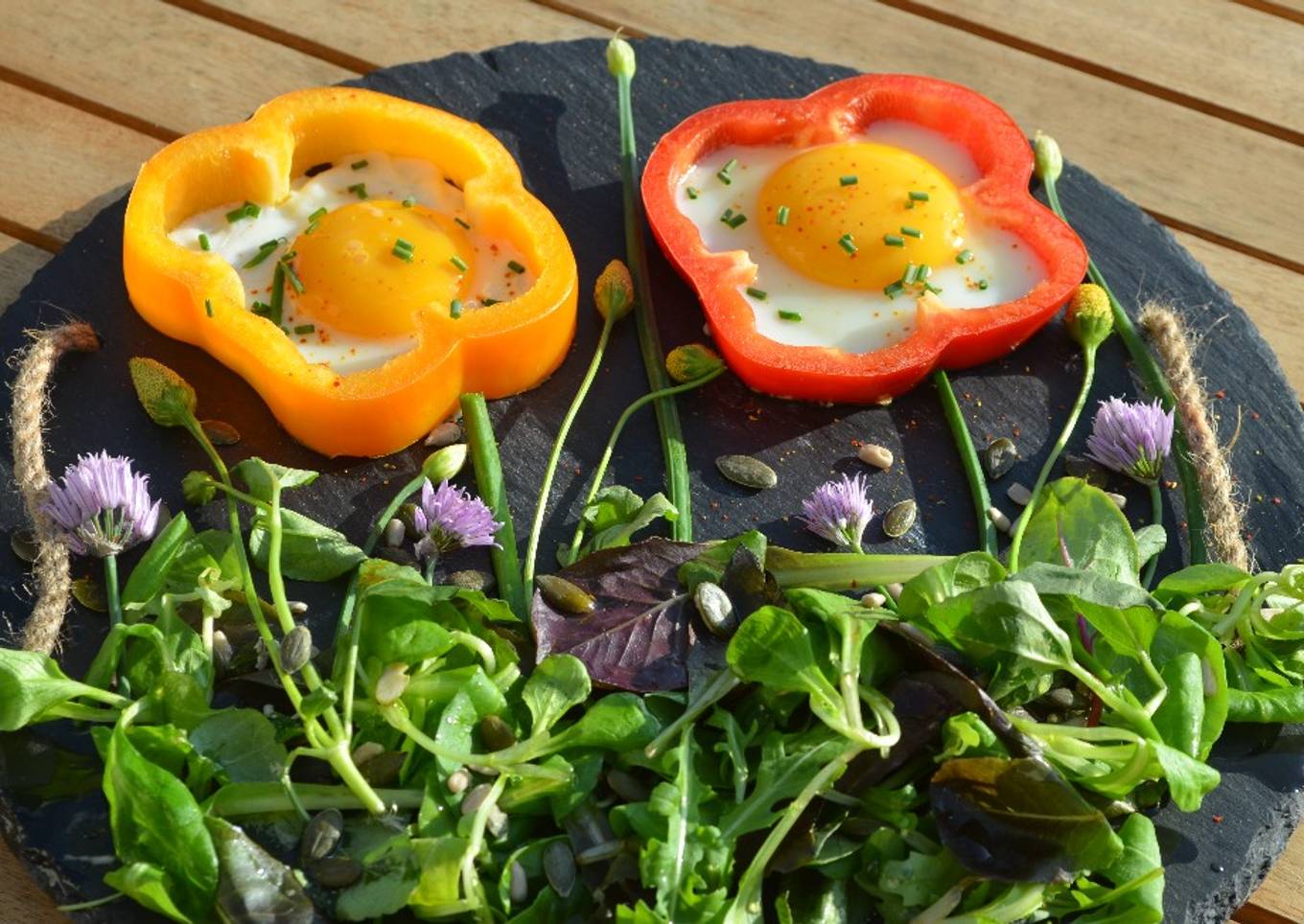 - Casser délicatement les œufs dans les rondelles de poivron. Saupoudrer de piment et de ciboulette