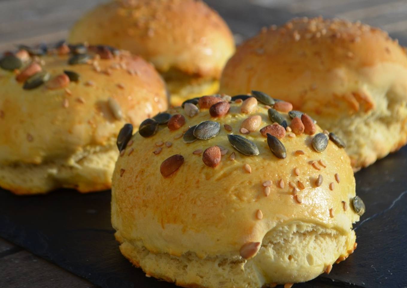 Dorer avec 1 jaune d'oeuf et 1cs d'eau pour une dorure claire. Saupoudrer de graines de sésame et cuire 15min au four à 180°C! Garnir à votre guise : cheddar, salade, oignons frits, steak haché, sauce barbecue,...
