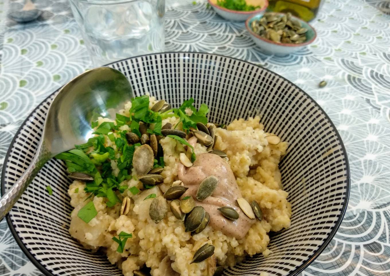 - Servir chaud, saupoudré de persil ou coriandre frais et de graines de courge torréfiées. Ajouter une goutte d'huile d'olive ou 1/2 cuillère à café de purée d'amandes.