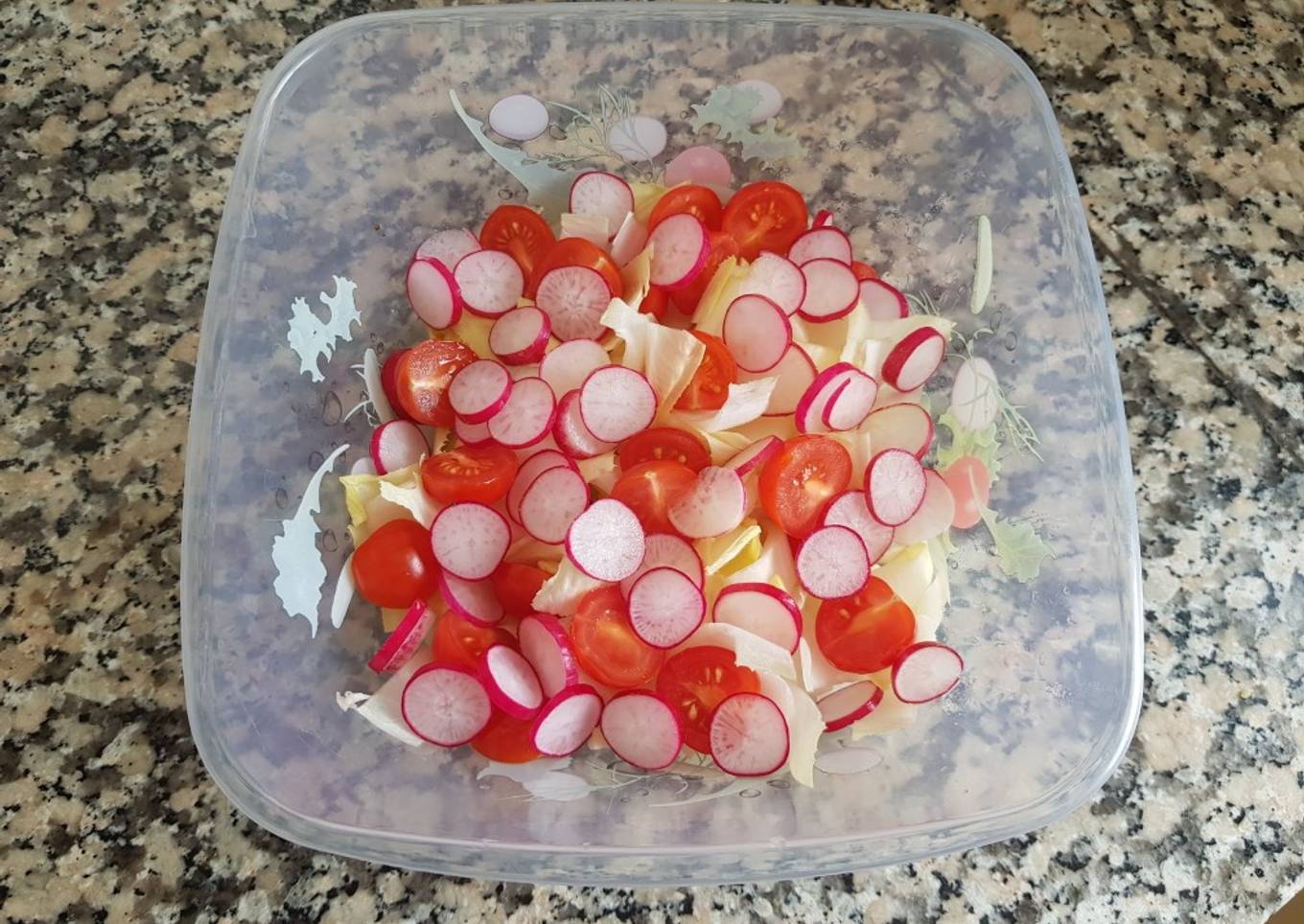 - Couper le endives en tronçons moyens. Au fond du saladier preparer la vinaigrette. Mettre les endives dans le saladier et le graine de courges. Couper en fines rondelles les radis et en 4 les tomates cerises. Les mettre sur les endives et mélanger. Bonne dégustation