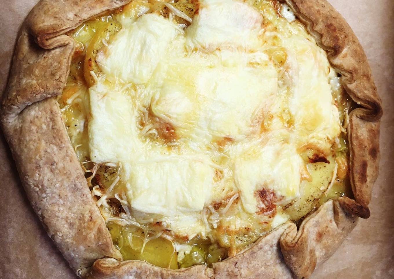 - Commencez par mettre la préparation crème/oignons/jambon dans le fond de tarte puis placez les pommes de terre en rosace salé poivrer et terminer par mettre le fromage à raclette.. replié les bords de la pâte sur elle même